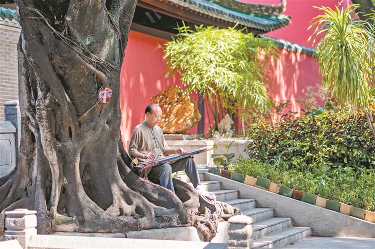 为了体验古琴技艺,日前,小麦来到广州五羊仙观,只见一位老先生坐在红墙前的古榕下,把古琴平放在双腿上,写意地弹奏起来。在小麦印象中,琴者多坐于琴桌前抚琴,这才是高雅姿态。这位岭南古琴艺术家区君虹,却追求一份“野趣”。对此,他笑着说,“坐在树木间、石头上抚琴,与环境融为一体,这是我们向往的真性情。”