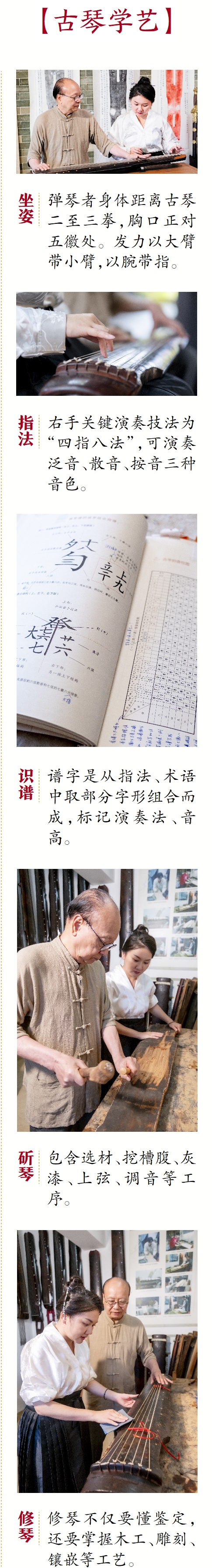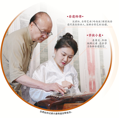 如今,区师傅将更多精力投入到古琴艺术传承推广中。4月,区师傅与儿子区宏山联手广东第二师范学院共建“岭南古琴实践教学基地”,让学生有机会向名家学琴。让区师傅惊喜的是,“宏山学的是商务英语,没想到这在古琴艺术交流上发挥作用。北京冬奥会前夕,有外国主播来到永庆坊体验岭南文化,宏山现场就用流利的英语来了一段即兴教学。”