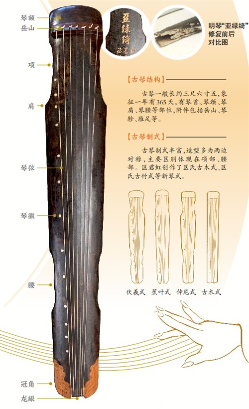作为“琴棋书画”四艺之首,古琴是中国最早的弹拨乐器之一,承载着深厚的文化底蕴。区君虹介绍,“古琴形态为人身凤形,广涉宇宙天地、五宫四调等。最初,古琴仅有五弦,象征金木水火土,传说周文王、周武王各增添一弦,古琴又有‘文武七弦琴’之称;古琴面板是圆弧形,象征天,底板平直,象征地,体现了古人对世界的理解;底板汇聚诗词文学、书法篆刻、雕刻艺术,能彰显琴家的文化品位。”
