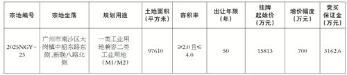 经广州市南沙区人民政府批准,广州市规划和自然资源局南沙区分局公开挂牌出让1宗国有建设用地使用权。
