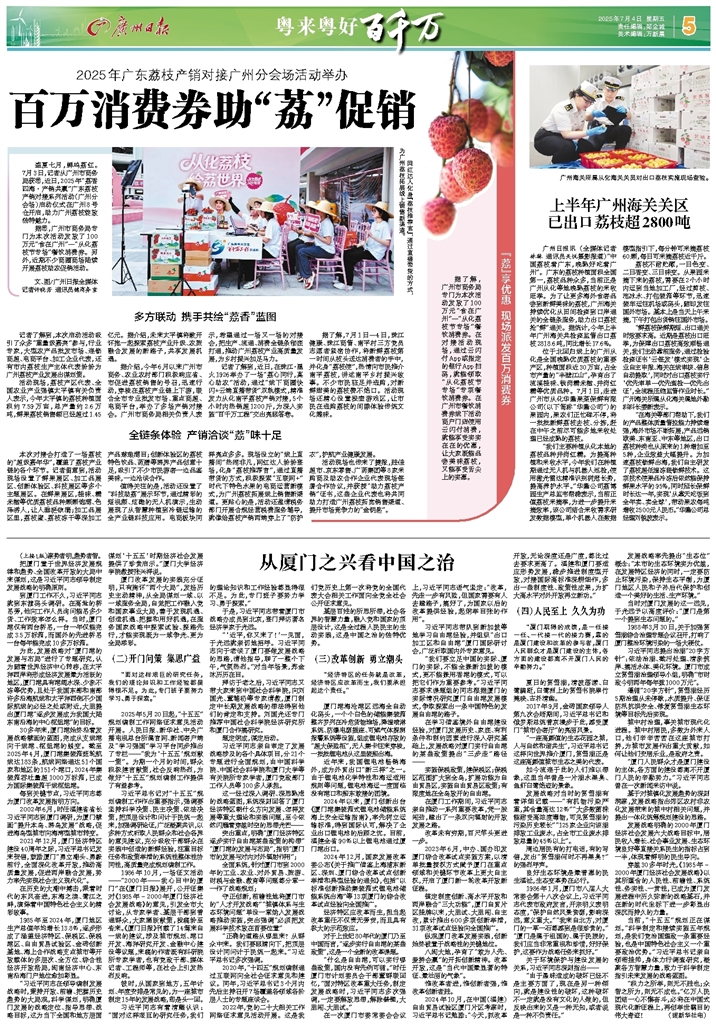 - 百万消费券助“荔”促销 盛夏七月,蝉鸣荔红。7月3日,记者从广州市商务局获悉,近日,2025年“荔香四海・产销共赢”广东荔枝产销对接系列活动(广州分会场)启动仪式在广州8号仓开启,助力广州荔枝绽放独特魅力。 据悉,广