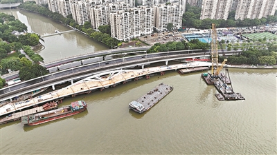 7月11日,随着最后一段钢梁吊装到位,连接广州塔和琶洲西区的黄埔涌步行桥顺利合龙,桥梁主体结构施工取得决定性进展。作为广州市住房和城乡建设局统筹的城市品质提升工程项目,黄埔涌步行桥预计8月底前完成建设,将解决交通断点问题,形成步移景异的慢行桥梁,成为连接沿江绿道与城市核心区的关键纽带。