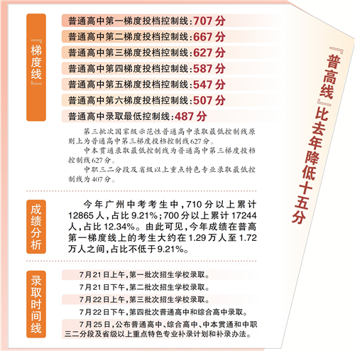 7月19日上午,广州市2025年中考成绩发布会在广州市招生考试委员会办公室举行。今年广州普高录取最低控制线为487分,较去年降低15分;普高第一梯度投档控制线为707分,较去年提升5分;中职三二分段及省级以上重点特色专业录取最低控制线为407分。全市总分平均分为555分。高中阶段学校录取工作将于7月21日启动。
