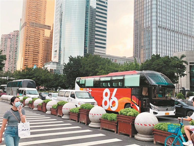 在天河体育中心北入口附近,天河北路西往东方向上的非机动车道近日刚完成翻新,地面非机动车道标线清晰。不过,这里最近却成为部分大巴和小轿车的违停点。从早上到傍晚,每天都有不少大巴在这里违停,部分小轿车也会选择在这里随意停放。有时大巴甚至与小轿车同时占据两条车道违停,令人担忧。
