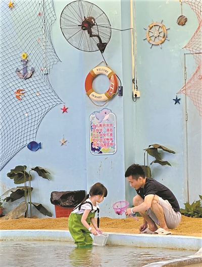 “本来想带孩子去海边玩水,但天气太热了,我们就选择了这家室内赶海亲子乐园。孩子尝试了钓鱼、钓螃蟹,很开心。”小心的家长说,带着孩子来体验室内海钓,真是遛娃避暑两不误。