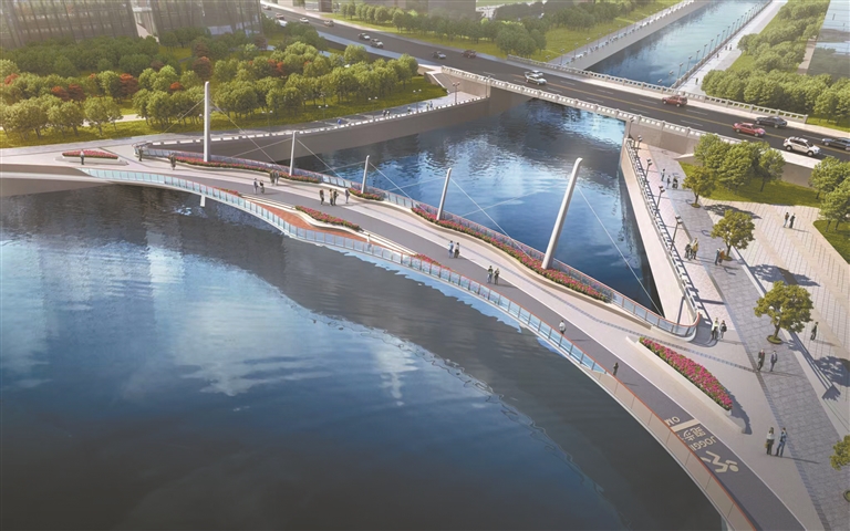桥梁全长约96米,以“帆影流韵”为设计主题,将海上丝绸之路文化寓意和桥梁结构相融合,将帆船意象融入桥梁设计,塔柱与拉索形似帆船桅杆与缆绳,整体造型富有动感。桥面将设置3米宽步行道与2米宽跑步道,搭配休憩座椅、绿化花池等,满足不同群体需求,实现运动、通行与休闲功能的巧妙结合。