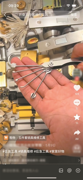 记者登录多个电商平台搜索“开锁工具”“开锁神器”,均有大量相关商品页面弹出。而在一些社交平台搜索类似关键词,不仅能搜出大量详细讲述如何开各种锁的教程,还有不少教人开锁的网络直播,这些“教程”的内容十分翔实,针对不同类型的锁都有相应的方法。在其中一场直播中,一位博主声称“只要用六根奇形怪状的小铁片,什么类型的锁都能开,甚至是防盗级别较高的智能门锁。”