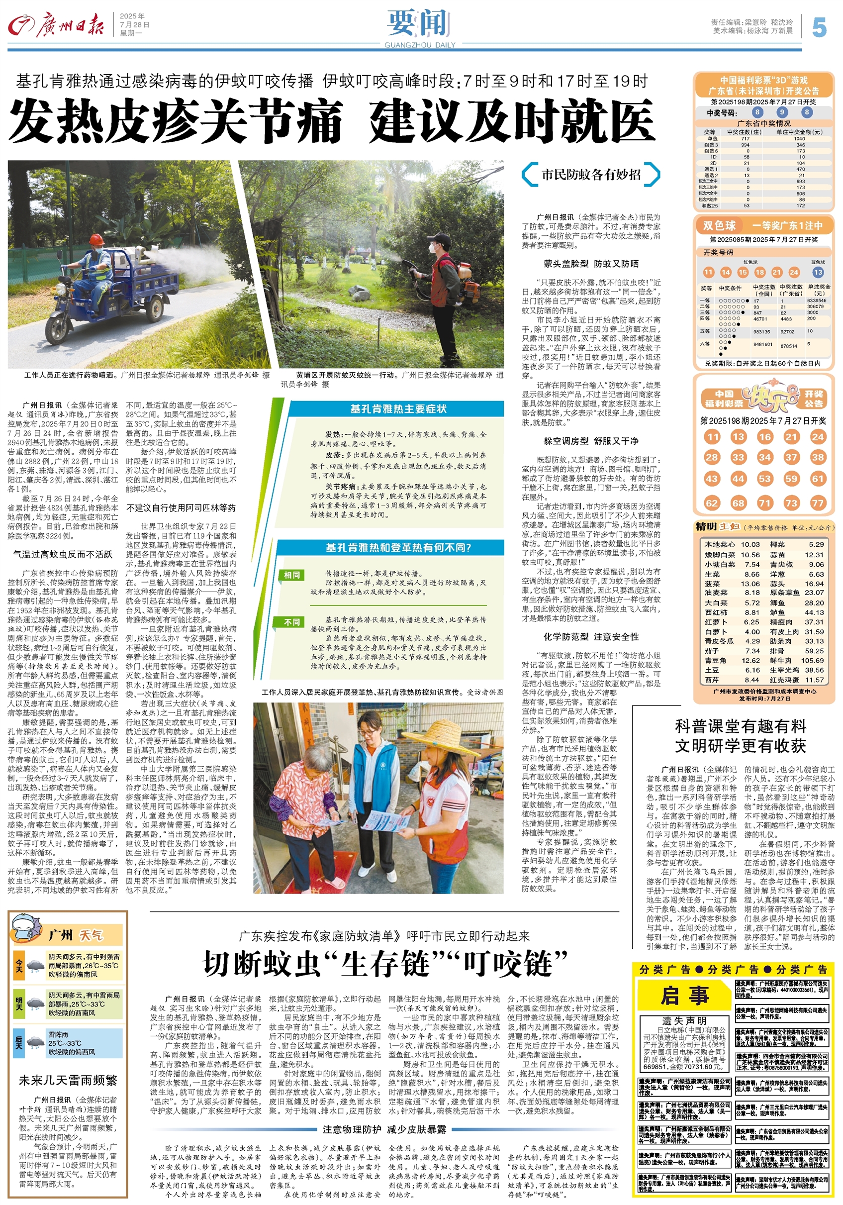 - 发热皮疹关节痛 建议及时就医 广州日报讯 (全媒体记者梁超仪 通讯员肖冰)昨晚,广东省疾控局发布,2025年7月20日0时至7月26日24时,全省新增报告2940例基孔肯雅热本地病例,未报告重症和死亡病例。病例分布在佛山28