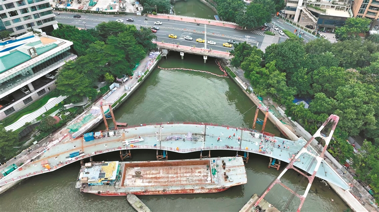 广州日报讯 (全媒体记者李天研)昨日,横跨海珠涌(马涌)的人行桥正式合龙。海珠涌人行桥作为珠江两岸品质提升项目之一,西起海印公园,东接海珠半岛花园,全长约96米,设置3米宽步行道与2米宽跑步道,搭配休憩座椅。项目预计8月底完工,将打通珠江前航道南岸慢行系统断点。