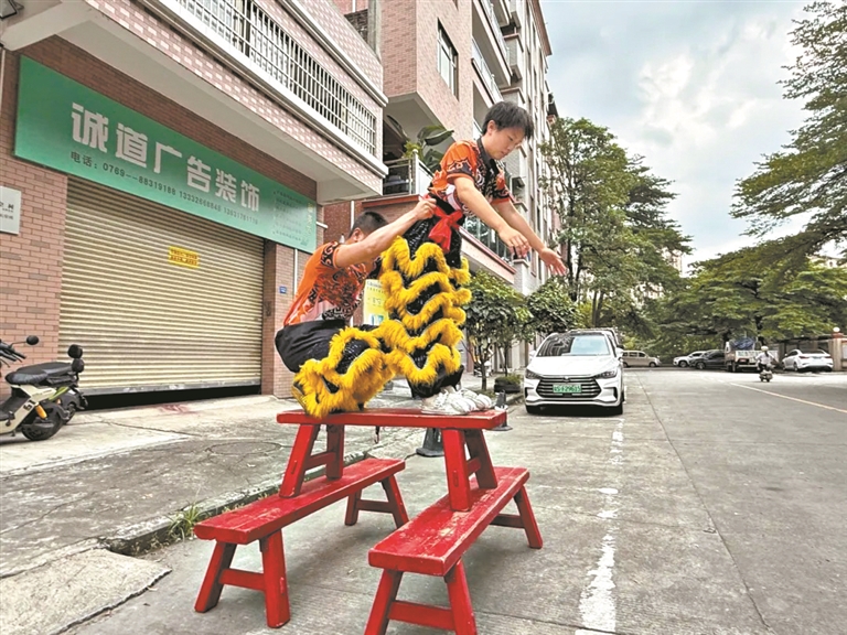 在东莞道滘祥和醒狮队的训练场上,一个矫健的身影格外引人注目。她腾挪跳跃,与狮尾配合默契,一招一式都透着股不服输的劲头。这个身影属于小和(全名秦和,以下称“小和”)。她是东莞轻工业学校的高一学生,同时也是道滘祥和醒狮队里唯一的女队员。“醒狮不分性别,能吃苦、有毅力才是关键。”小和的热爱和坚持、力量与汗水,让大家看到不论男女,都能成为舞台上矫健灵巧、大放异彩的醒狮。