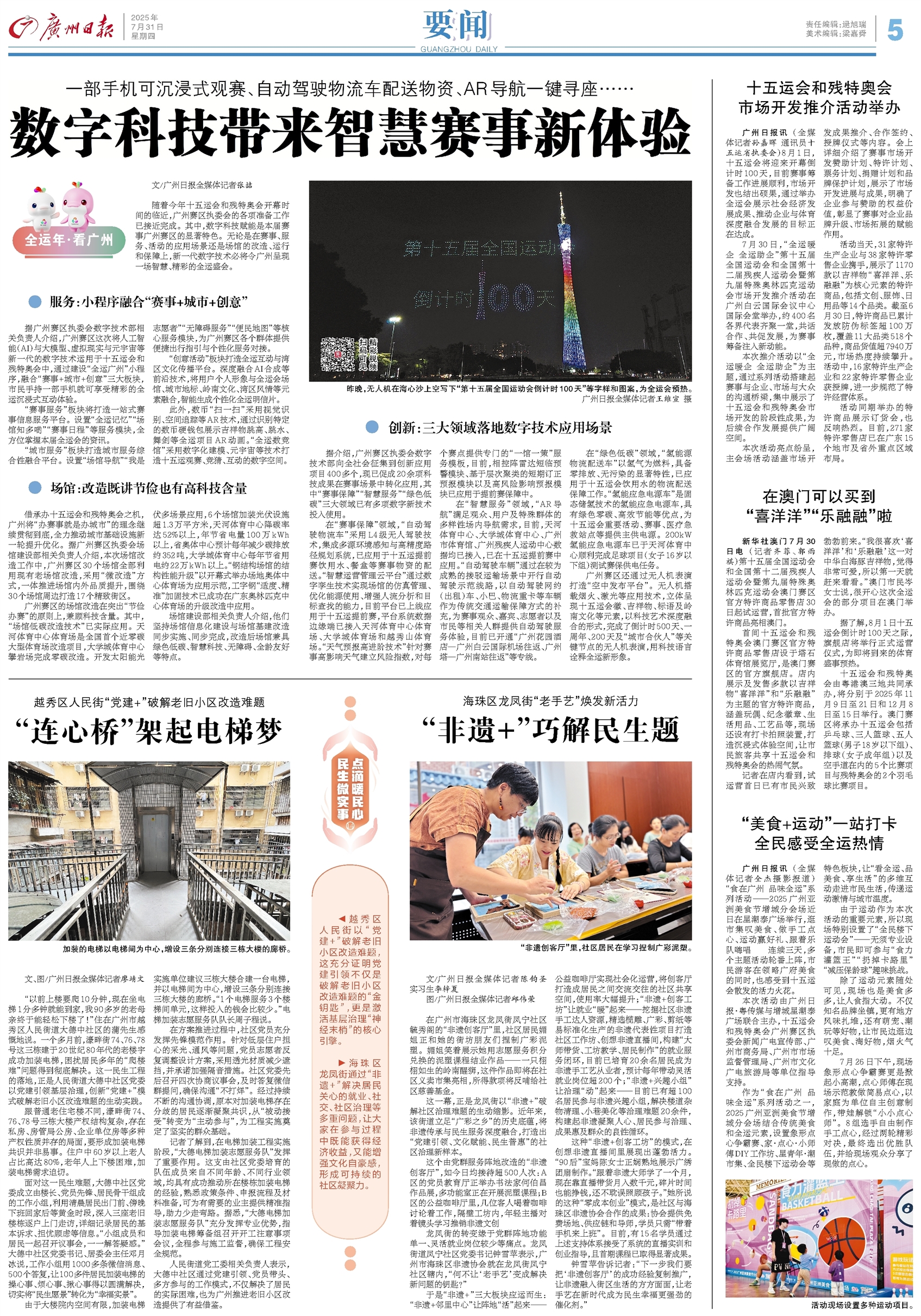 据广州赛区执委会数字技术部相关负责人介绍,广州赛区这次将人工智能(AI)与大模型、虚拟现实与元宇宙等新一代的数字技术运用于十五运会和残特奥会中,通过建设“全运广州”小程序,融合“赛事+城市+创意”三大板块,市民手持一部手机就可享受精彩的全运沉浸式互动体验。