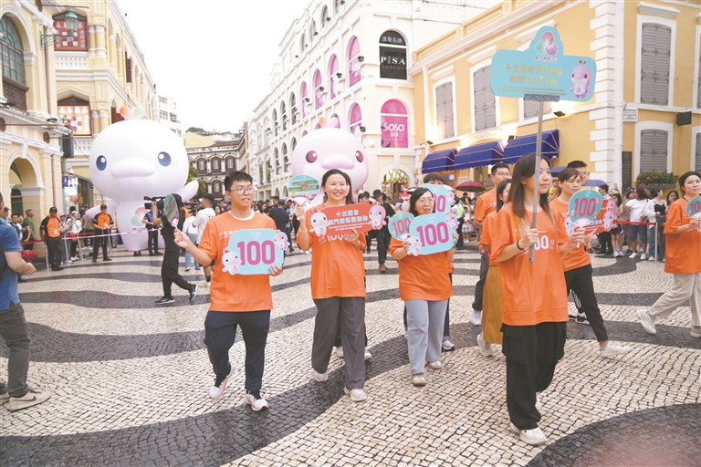 澳门特区的全运会开幕倒数一百日活动多姿多彩,大三巴“迎百日健步行”现场,市民和游客将整个大三巴布置成欢乐的海洋,志愿者身穿橙色上衣,摆出了“100”的数字造型,而更多参加活动的市民则举出“100”字样的手举牌,接受记者采访时,有市民说道,“倒计时100天参加这样的活动很有意义,这个‘100’的牌子不仅是100天的倒计时,还寓意本次全运会一定会取得‘100分’的成功!”