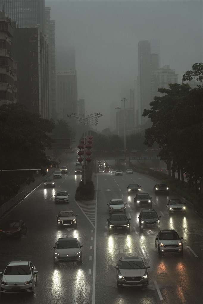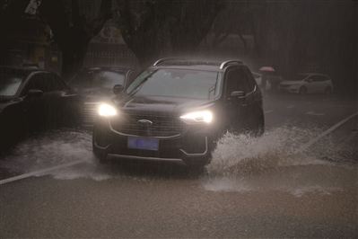 昨日上午,佛山各区普降暴雨,禅城区雨量进入“倒水”模式,季华路上白天如夜,车灯长亮,车辆如在河中行驶,唐园附近的街道成了小河,市民蹚水在路中行走,给其带来极大不便。预计暴雨天气将会持续,出门的市民要注意安全。