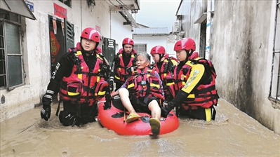 现场水流夹杂杂物,橡皮艇行进困难。消防员逐一协助被困群众穿戴救生装备,分批次将其转移至艇上,最终成功将6名群众转移至地势较高的安全区域。