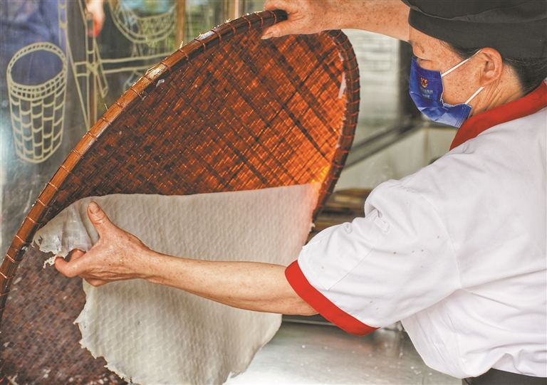 传说真假已难考,可沙河粉确实薄得透光、韧得弹牙,迅速成为沙河的金字招牌。至20世纪初,广州城里的茶楼纷纷派伙计挑着箩筐到沙河订货,沙河粉的生意好得很。后来的沙河大饭店,更将沙河粉推至巅峰,开发出烹法多变、五味纷呈的沙河粉,引得中外宾客慕名而来,并收获“羊城美食遍千户,山水河粉独此家”的盛誉。不仅如此,沙河粉还被带到了广西、福建和东南亚等地,变成当地常见的主食。