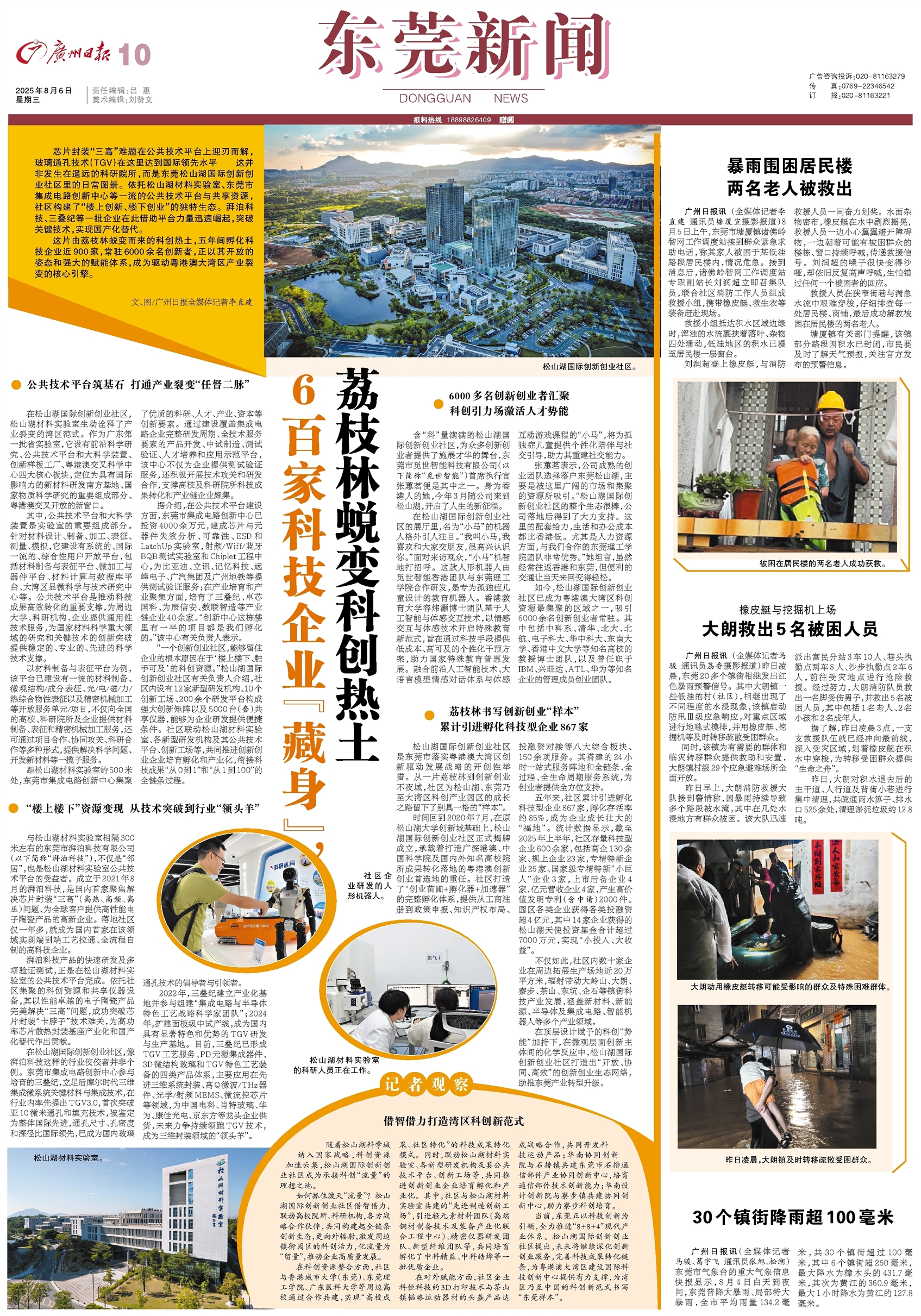 - 6百家科技企业“藏身”,荔枝林蜕变科创热土 芯片封装“三高”难题在公共技术平台上迎刃而解,玻璃通孔技术(TGV)在这里达到国际领先水平……这并非发生在遥远的科研院所,而是东莞松山湖国际创新创业社区里的日常图景。依托松山湖材料实验室、东莞市