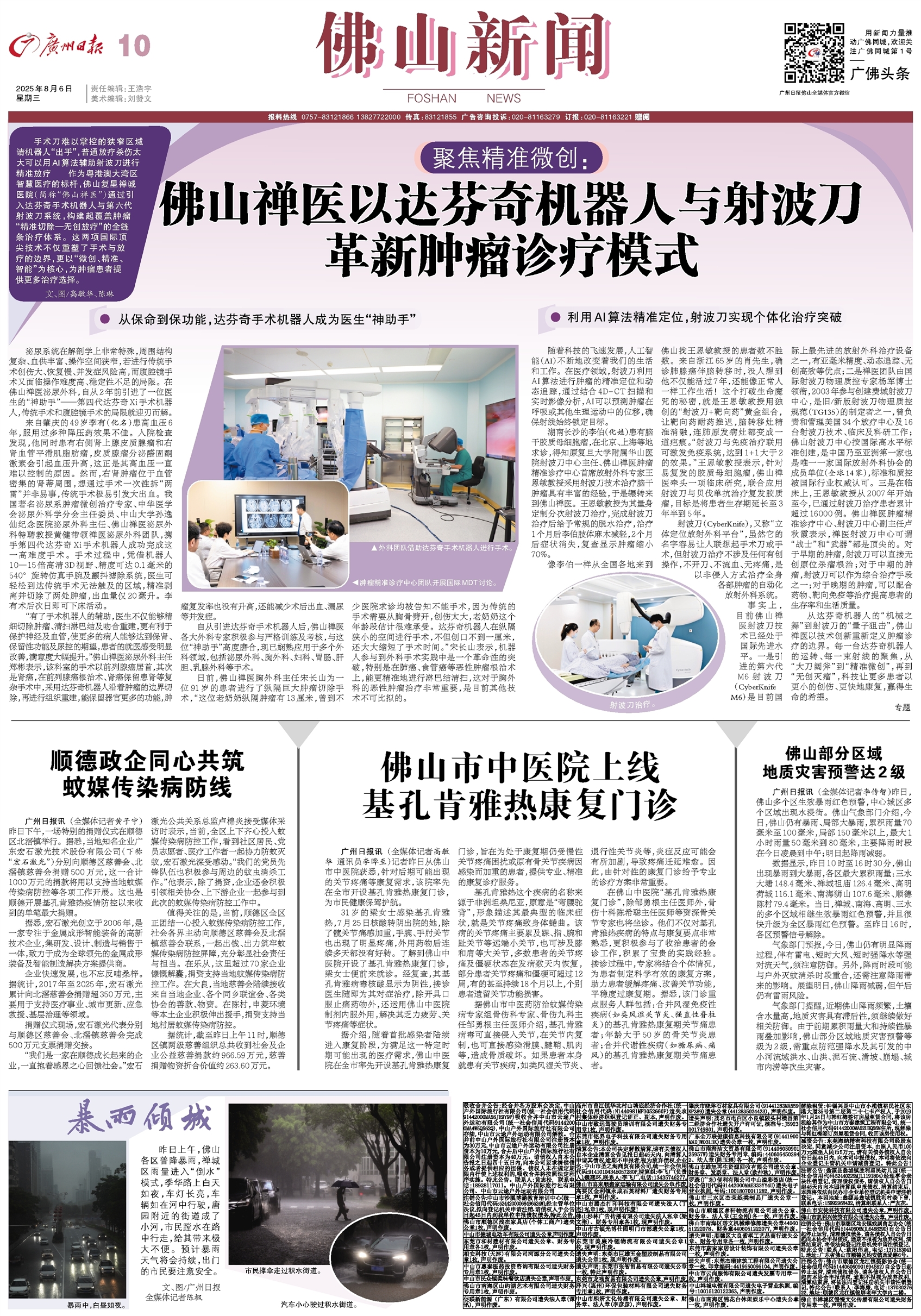 - 佛山禅医以达芬奇机器人与射波刀革新肿瘤诊疗模式 手术刀难以掌控的狭窄区域请机器人“出手”,普通放疗杀伤太大可以用AI算法辅助射波刀进行精准放疗……作为粤港澳大湾区智慧医疗的标杆,佛山复星禅诚医院(简称“佛山禅医”)通过引入达芬奇手术机器人与第六