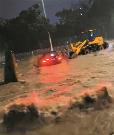 千钧一发之际,付光路来不及多想,冒着倾盆大雨,蹚过约80厘米深的积水跑回店里,迅速启动铲车,冲向事发地救人。