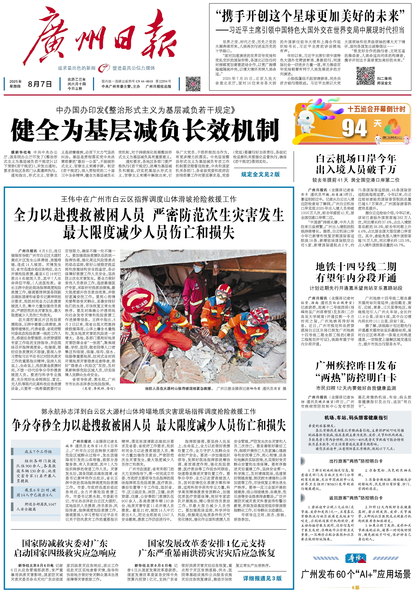 - 全力以赴搜救被困人员 严密防范次生灾害发生 最大限度减少人员伤亡和损失 广州日报讯 8月6日,连日强降雨导致广州市白云区大源村黄庄片区发生山体滑坡、房屋垮塌,造成14人被困。灾情发生后,省市迅速启动应急响应,全力开展抢险救援,截至6日19时已救出8名被困人员,其中7人