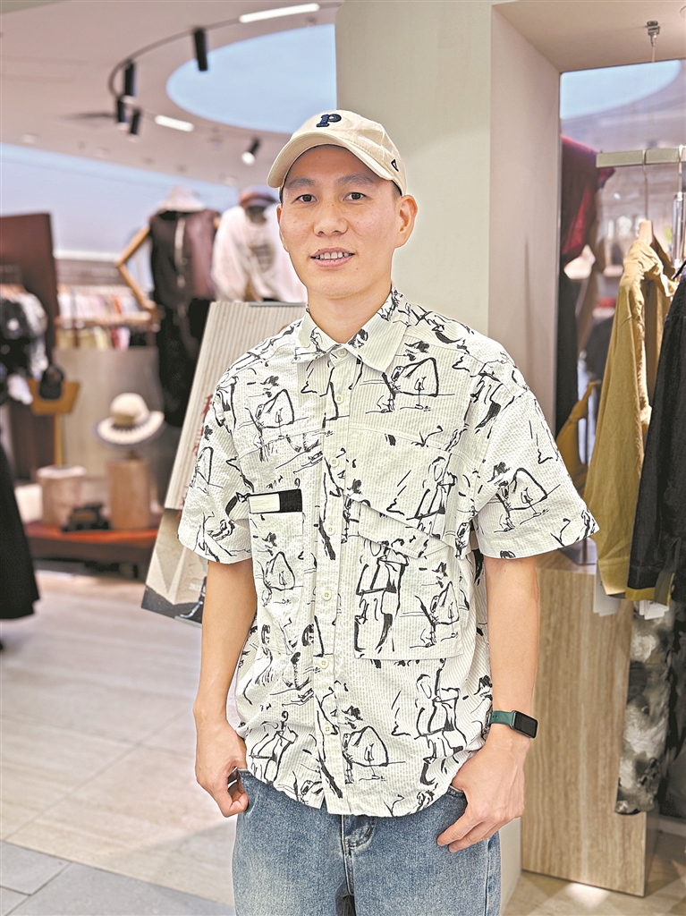 上午9点左右,余雄生拿着手机在白马服装市场不同楼层的店铺内直播。“我将镜头再放近一些,大家可以看到他们家这条秋冬款长裙的图案”“他们家还有其他款式的长袖上衣,想看的我带你们进去再看看”……余雄生告诉记者,“每天上午9点左右到11点半,两个小时就是我们的直播时间。”过程中,他和助播带上直播器材,穿梭于不同店铺,为直播间的采购商们带来服装直播。