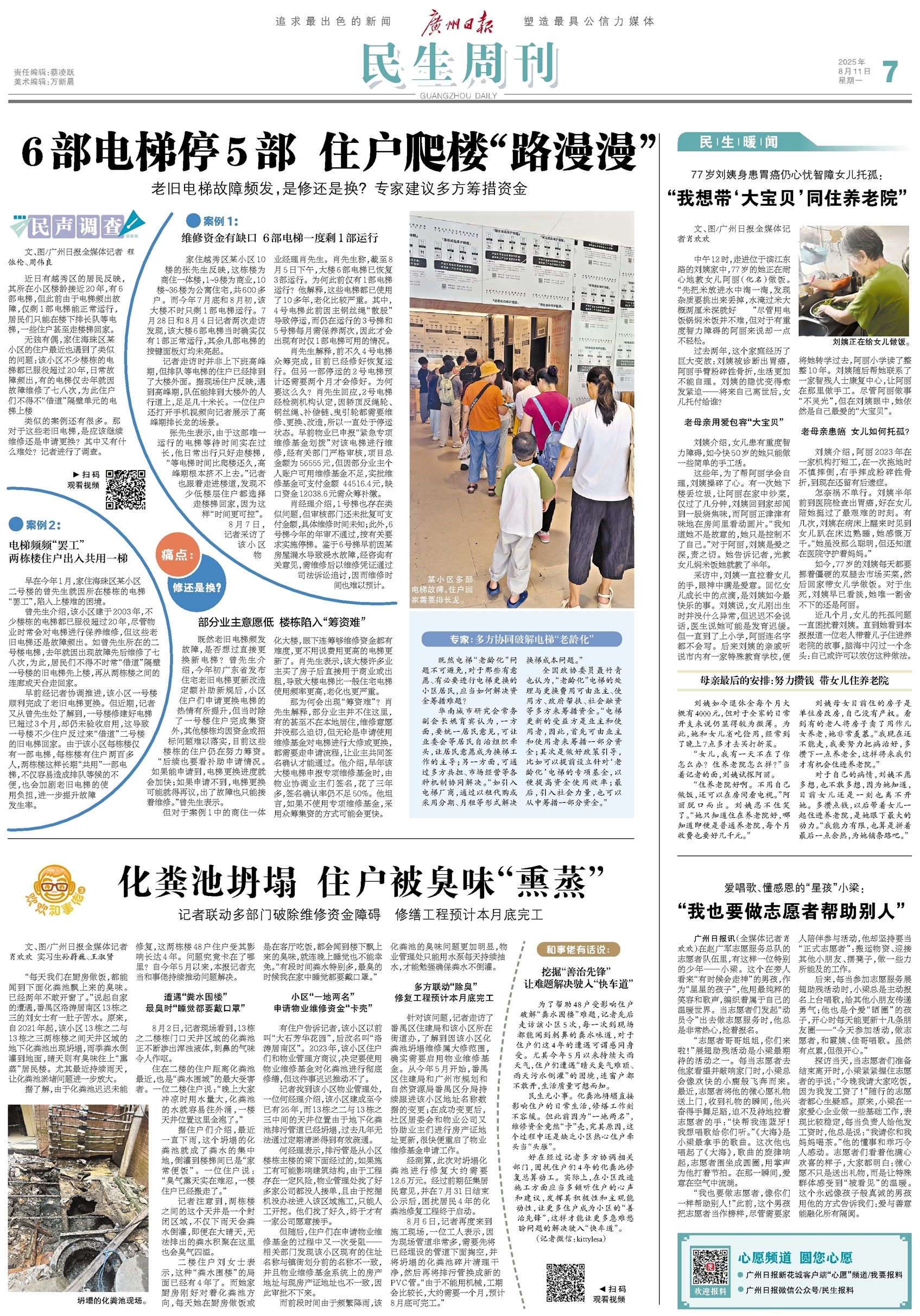 - 6部电梯停5部 住户爬楼“路漫漫” 民声调查 文、图/广州日报全媒体记者 程依伦、周伟良 近日有越秀区的居民反映,其所在小区楼龄接近20年,有6部电梯,但此前由于电梯频出故障,仅剩1部电梯能正常运行,居民们只能在楼下排长队等