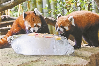 小熊猫玩冰块。