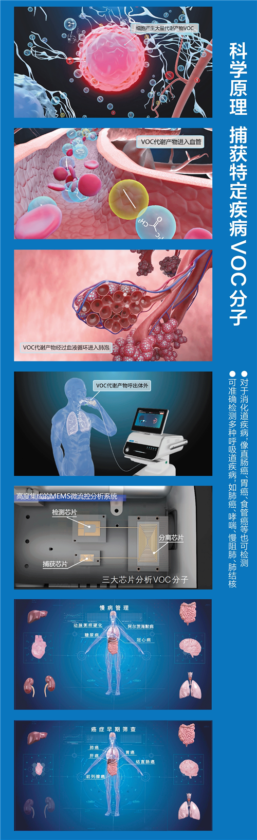 芯片化呼气分子分析微型气相色谱仪的发明者、精智未来(广州)智能科技有限公司(以下简称“精智未来”)创始人王俊奇告诉记者,呼气检测基于呼气代谢组学和由全世界科学家共同建立的人类呼气代谢组学数据库。