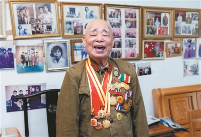 走进叶发家中,客厅的一面墙上几乎挂满了老照片,其中不乏他身着戎装的照片。回望不满13岁投身抗战的烽火岁月,坐在桌旁的叶老脊背笔挺,沉默了一会儿才开口讲述。