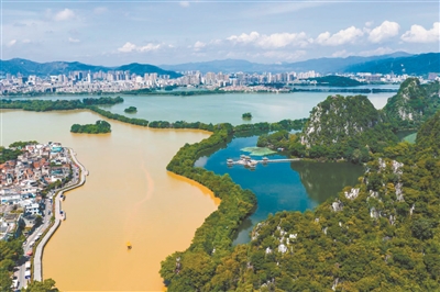 广州日报讯 (全媒体记者于敢勇 通讯员梁亮摄影报道)受前段时间肇庆端州区北岭山上洪水影响,近日肇庆著名景区星湖呈现出“一湖三色”的奇特景观,吸引了不少游客前来拍照观赏。
