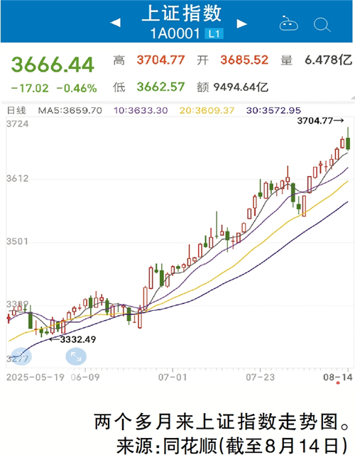 近期A股市场热度居高不下,连创阶段性新高。8月14日,沪指盘中突破3700点,为2021年12月以来首次。不过随后回落微跌,终结8连阳。而对于近日的A股表现,不少投资者却陷入了“既想又怕”的两难:一边怕“踏空”行情,想赶紧入场;另一边又担心“高位接盘”,买在山顶。对此,多位业内人士的建议高度一致:不盲目追高,不妨“等回调”再逐步布局。同时,可聚焦政策支持、高景气、低估值修复的板块,优先低估值、业绩确定的标的,避开炒作股和高风险股。
