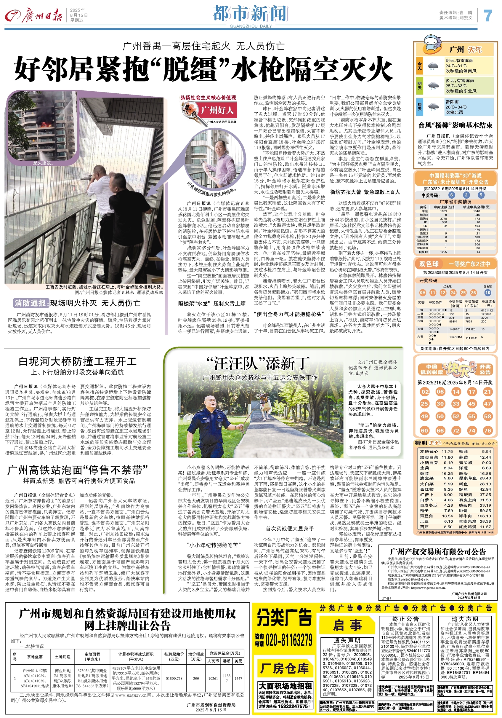 - 好邻居紧抱“脱缰”水枪隔空灭火 广州好人栏目·寻找广州人身边的平民英雄 广州日报讯 (全媒体记者肖桂来)8月11日傍晚,广州市番禺区雅居乐花园北苑佰利山小区一高层住宅突发火灾。危急时刻,隔壁楼栋居民叶金峰临危不乱:他迅速启动