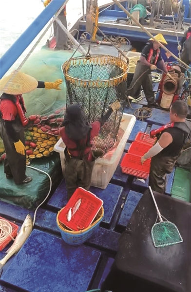 记者看到,一艘渔船从远方驶入码头外的水面,渔民将渔获搬到接驳小艇上,再返回岸边。接驳船上,装满了刚从海上捕捞的新鲜渔获。渔民合力将渔获搬上码头,尽管汗水浸湿了衣衫,但他们的笑容却格外灿烂。