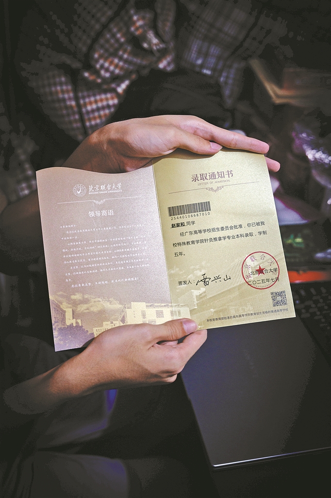 这个暑假,18岁的全盲学生赵家和迎来了人生转折——他以710分的优异成绩考上了北京联合大学。走出广州市启明学校熟悉的盲道,他将独自面对更为复杂的社会环境,也将在全新的城市里开启独立生活的新阶段。从江门小村到首都北京,从盲校学霸到逐梦青年,他的故事不仅写下了努力与坚持,更让人看见一代视障学子昂首走向未来的坚定身影。