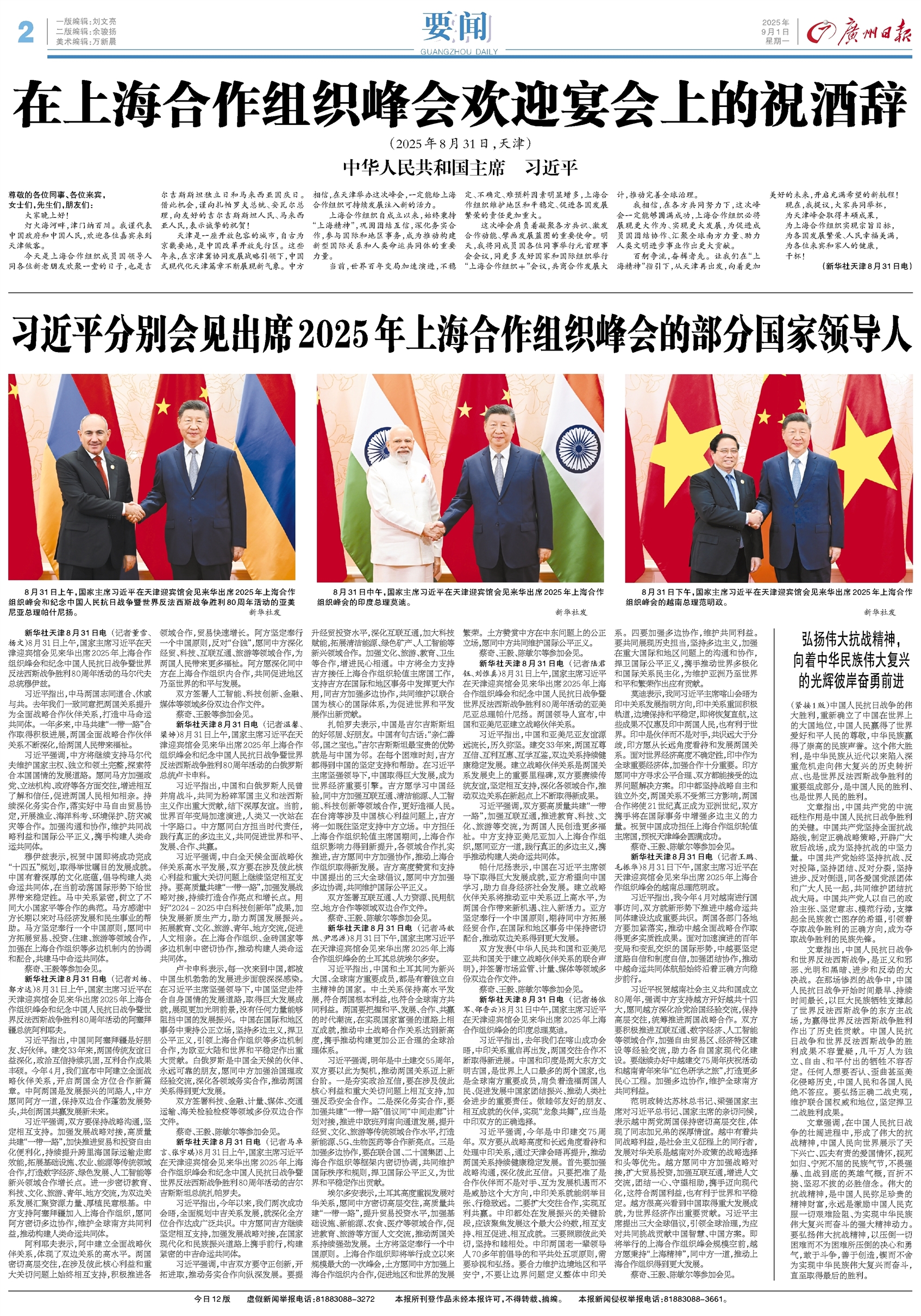 - 习近平分别会见出席2025年上海合作组织峰会的部分国家领导人 新华社天津8月31日电 (记者董雪、杨文)8月31日上午,国家主席习近平在天津迎宾馆会见来华出席2025年上海合作组织峰会和纪念中国人民抗日战争暨世界反法西斯战争胜利80周年活动的马尔代夫总统穆伊