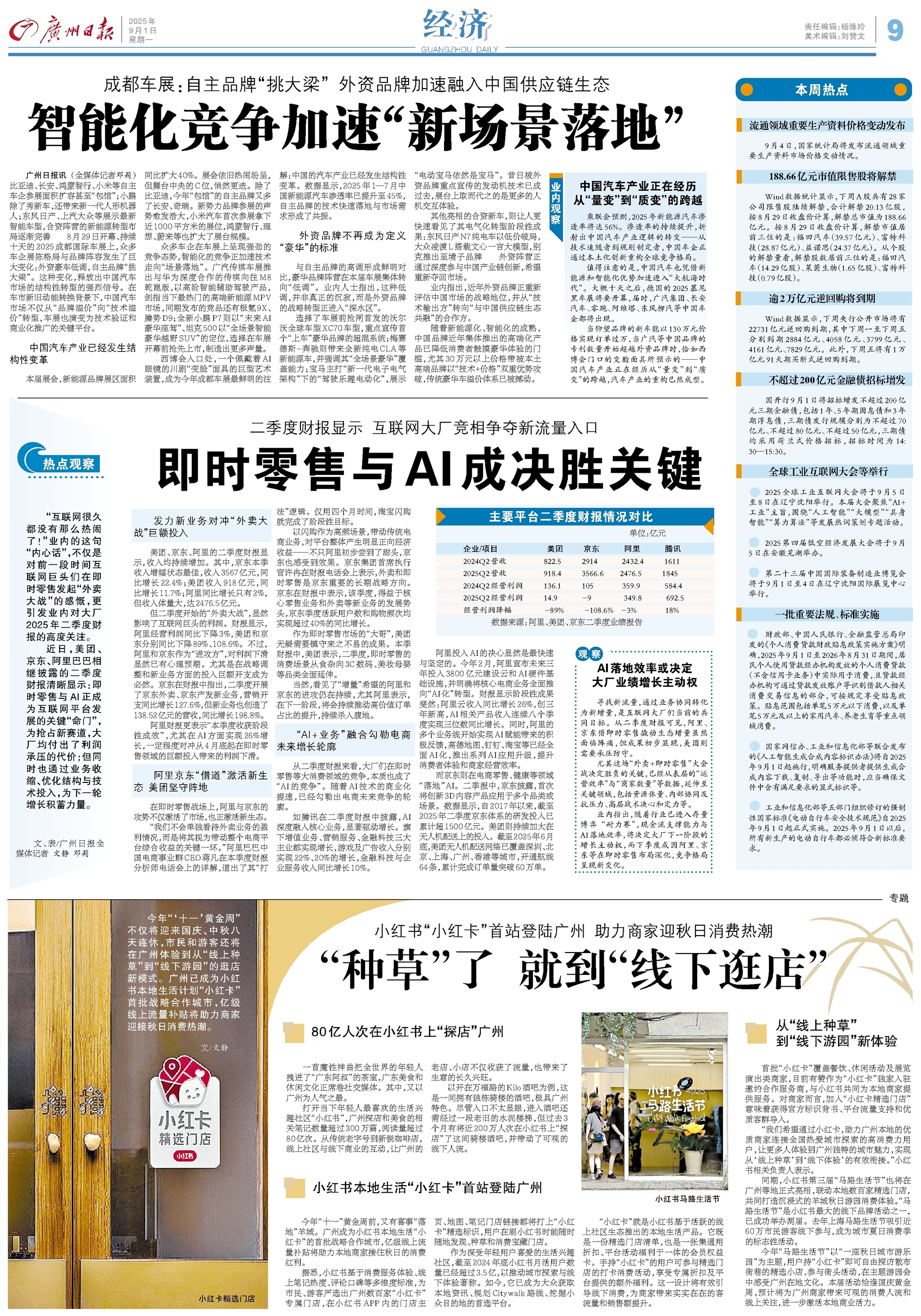 - 即时零售与AI成决胜关键 热点观察 “互联网很久都没有那么热闹了!”业内的这句“内心话”,不仅是对前一段时间互联网巨头们在即时零售发起“外卖大战”的感慨,更引发业内对大厂2025年二季度财报的高度关注。 近日