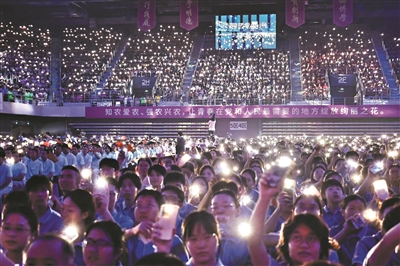悠扬的歌声中,典礼现场秒变“星海”演唱会;“人浪”互动将场内变成欢乐的海洋。激昂的鼓点、动感的节拍……热情的锣鼓声中,一只金色游龙翩然进场,可爱的醒狮摇头摆尾,引起阵阵欢呼。热烈气氛中,舞台屏幕上打出了当天生日的27名新生名单,全场师生送上惊喜祝福,温情满满。