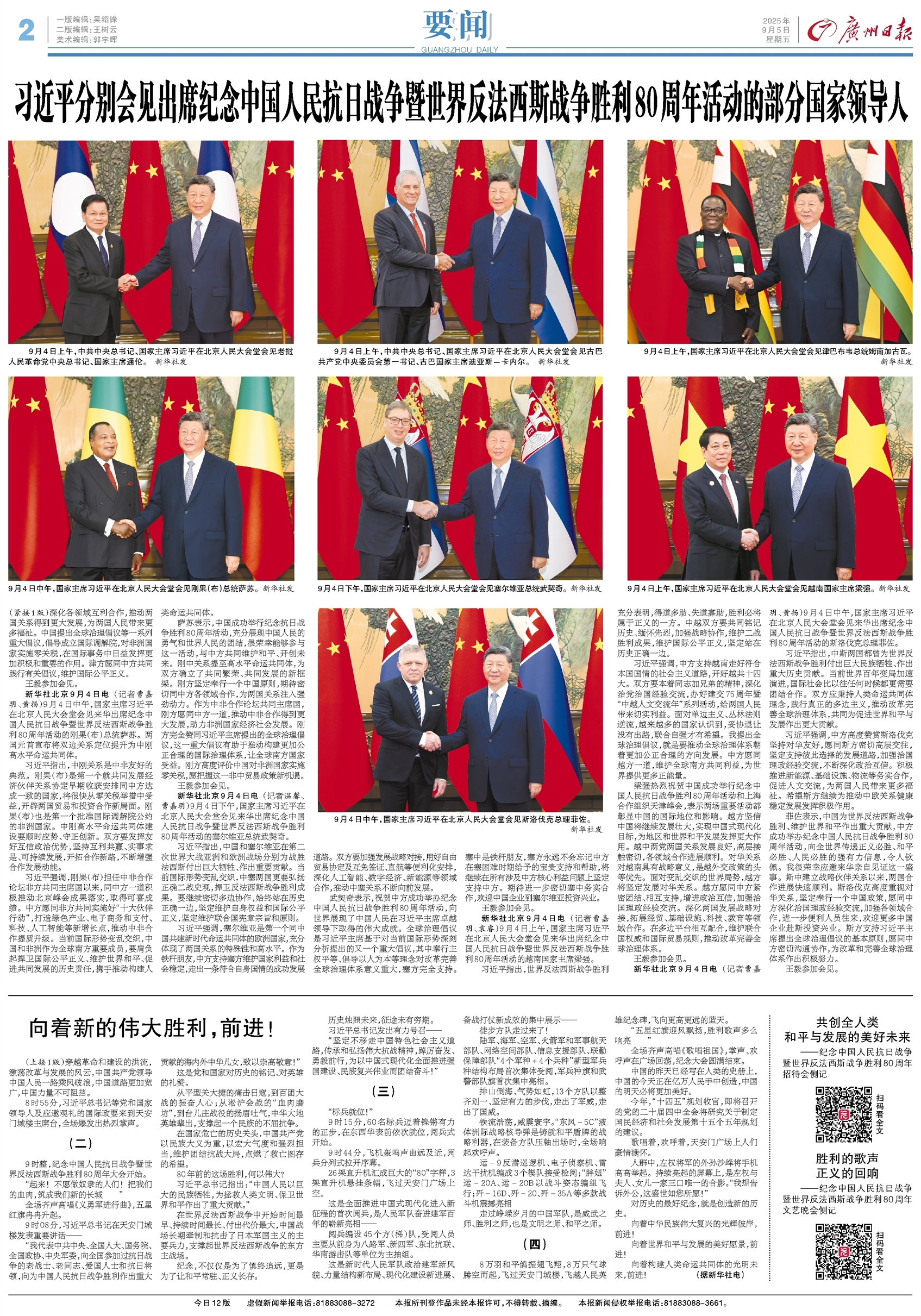 - 习近平分别会见出席纪念中国人民抗日战争暨世界反法西斯战争胜利80周年活动的部分国家领导人 (紧接1版)深化各领域互利合作,推动两国关系得到更大发展,为两国人民带来更多福祉。中国提出全球治理倡议等一系列重大倡议,倡导成立国际调解院,对非洲国家实施零关税,在国际事务中日益发挥更加积极和重要