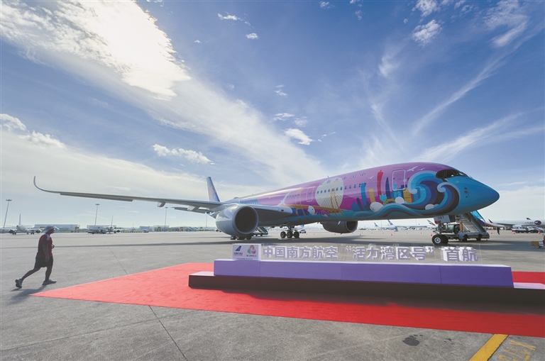 9月19日下午,中国南方航空首架十五运会主题彩绘飞机“活力湾区号”从广州白云国际机场起飞,搭载309名乘客飞往北京大兴机场,标志着首架主题彩绘客机正式投入运营。该主题彩绘客机后续还将执飞广州—上海浦东、广州—杭州、深圳—北京大兴、深圳—上海虹桥等多条航线。