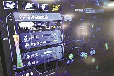 记者在位于天河体育中心的十五运会和残特奥会广州赛区交通运输服务中心见到了黄丙寅。在“新升级”的办公室内,他向记者展示了大屏幕上的十五运会智慧交通调度系统——从23家酒店、30个场馆的交通流线图到每辆车的实时位置与任务,都能以可视化的形式清晰呈现。
