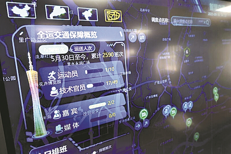 对突发情况的应对,更考验团队的“反应速度”。对十五运会女足测试赛进行交通保障的一次经历,让黄丙寅印象深刻:“当时路面出现拥堵,我们的调度指挥系统实时显示一整条路都‘飘红’了”。他立刻联系公安交管部门,“交警同志太给力了,马上派来两辆铁骑。”黄丙寅的语气十分激动:“原本以为会迟到4—5分钟,结果羊城铁骑一路开道,保障通道沿途还有不少交警指挥疏导,最后提前近10分钟到了场馆。看着羊城铁骑在车头领航,我心里一下子就稳了——这不是我们一个部门的事,是所有人在为赛事‘抢时间’。”黄丙寅说。