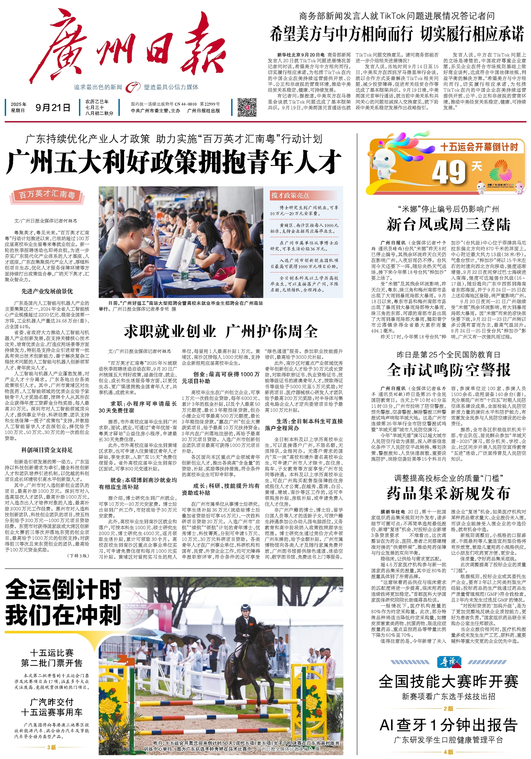 - 广州五大利好政策拥抱青年人才 百万英才汇南粤 求职就业创业 广州护你周全 文/广州日报全媒体记者何颖思 “百万英才汇南粤”2025年N城联动秋季招聘活动启动在即,9月20日广州梳理五大利好政策,涵盖住宿、就业、创业