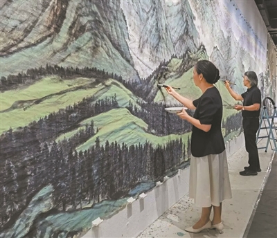 走进广州美术学院的创作室,只见在长16米、高3米的长卷上,碧水似镜的天山天池、巍峨挺拔的博格达峰、穿行在山脉间的兰新高铁、雄伟壮观的果子沟大桥以及牧场、云杉等新疆地标与自然景观尽收眼底,营造出宏大而静谧的美学氛围。