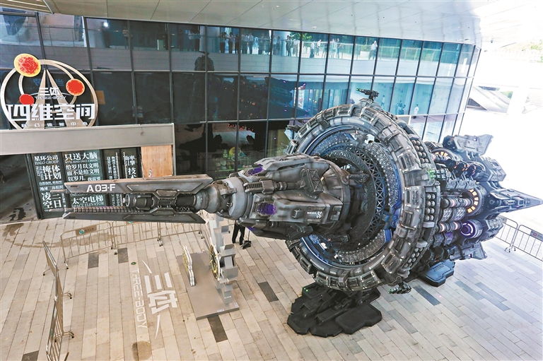 伴随书城开放,多场高水准文化展览同步启幕,为市民带来思想与美学的双重滋养。湾区民俗馆推出开馆大展“壁上丹青·盛世风华:壁画里的大唐”,联合陕西历史博物馆,通过相互呼应的高清壁画图片、VR沉浸体验、文物仿制品等,将唐代的开放包容与盛世气象娓娓道来,搭建起一座连接古今的文化桥梁。三体·四维空间作为华南首个《三体》主题科幻体验中心,配备VR大空间体验区与全国最大的“自然选择号”战舰装置,让科幻迷“走进”三体宇宙。浪浪山IP沉浸式大湾区首展以电影《浪浪山小妖怪》为主题,还原了影片中的经典画面,成为家庭游客和年轻群体的热门打卡点。“了不起的深圳黑科技”科技展厅则展现了深圳的创新硬实力,比亚迪、华为、大疆等企业的前沿成果集中亮相,全球首款全向避障无人机、智能抗流水下机器人等产品近距离呈现,让市民直观感受“深圳速度”背后的科技支撑。