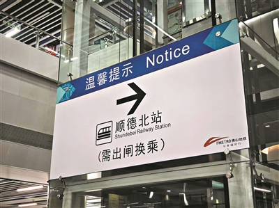 在佛山地铁与城际的换乘车站,关键客流路径上也新增了导向标识、墙贴、地贴等多元化导引标识。在城际换乘车站的醒目位置,设置了“广东城际时刻表”二维码。市民微信扫码即可查看最新列车班次、到发时间。