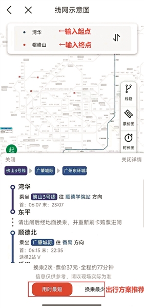 市民进入线网图后输入起点和终点,系统会自动推荐“用时最短”或“换乘最少”的“地铁+城际”出行方案,还可查看换乘次数、票价、行程时间等信息。此外,APP还支持出口资讯(含出入口公交车信息)、车站服务设施(如专用电梯、卫生间、母婴室)等拓展信息查询。