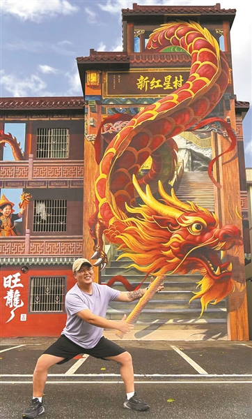 近日,清远石角新红星村的一处三层民宿墙面吸引众多游人来打卡——朱砂红与鎏金交织的龙形飞檐从建筑顶部延伸而出,3D透视打造的古建门楼里,“旺龙”非遗元素顺着山水纹路灵动穿梭,瑶族姑娘手持旺龙玩偶的画面更是成了游客争相合影的焦点。这面“旺龙非遗主题墙绘”以大胆浓烈的色彩碰撞、打破平面的艺术造型,让原本普通的民宿墙面蜕变为“一眼惊艳”的网红打卡地,为当地国庆文旅市场注入了意想不到的活力。
