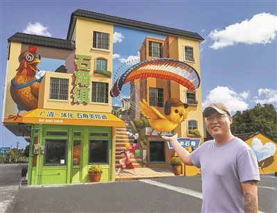 而在不远处的石角镇村口,另一处“清远鸡主题异形墙绘”同样人气爆棚:巨幅戴飞行眼镜的卡通清远鸡立在墙面上方,下方仿真门店与透视台阶串联起露营房车、彩色气球等元素,原本形状不规则的“短板墙面”,如今成了游客进村必拍的“乡镇名片”。这两处刷屏的墙绘作品,背后藏着一套“让墙面讲故事、助文旅添活力”的创作逻辑,更承载着一支墙绘团队十年深耕的坚守与初心。