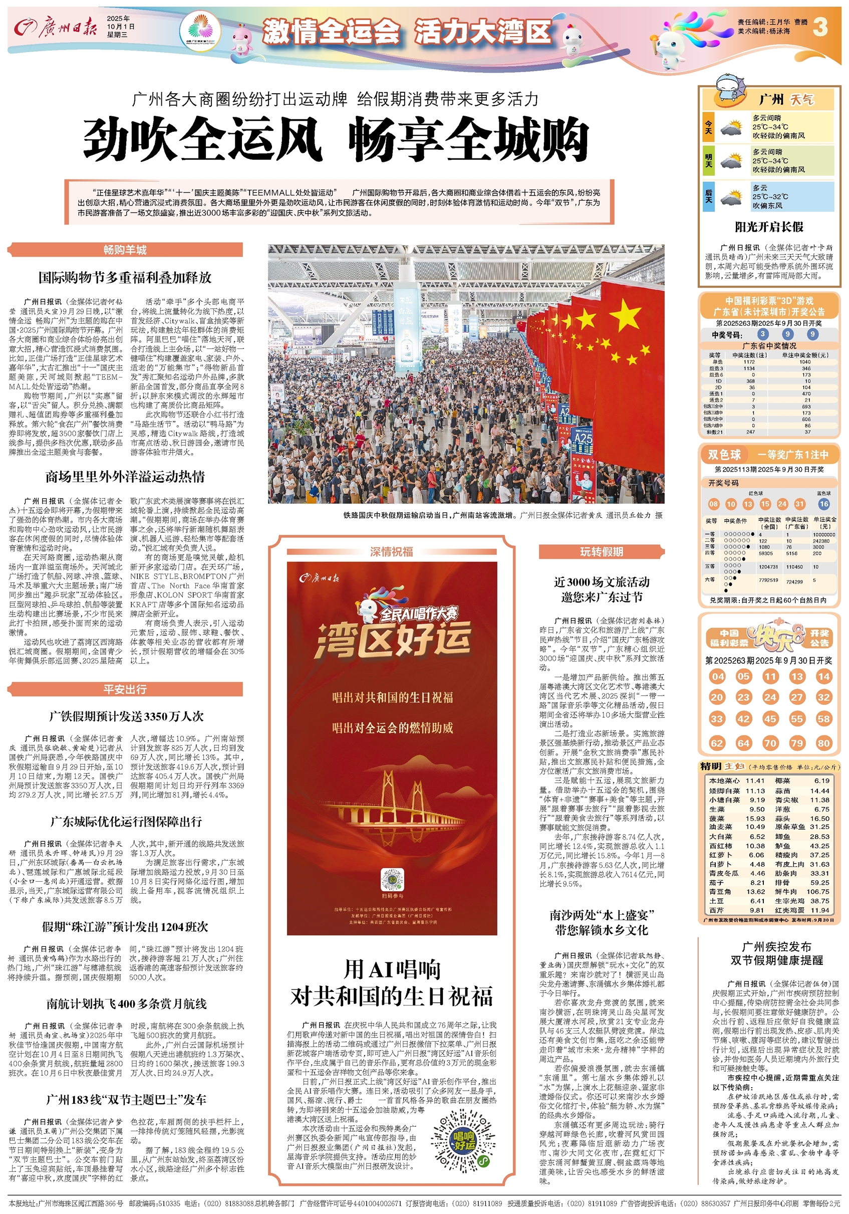 - 近3000场文旅活动邀您来广东过节 广州日报讯 (全媒体记者刘春林)昨日,广东省文化和旅游厅上线“广东民声热线”节目,介绍“国庆广东畅游攻略”。今年“双节”,广东精心组织近3000场“迎国庆、庆中秋”系列文旅活动。 一是增加