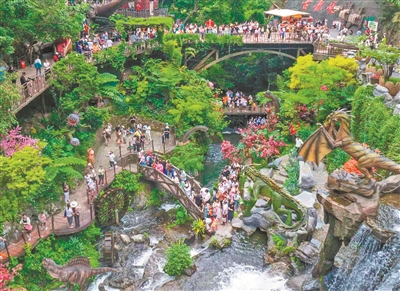 魅力金秋之山水之乐:国庆节假期,沉浸山水之乐,感受田园之美。清远古龙峡景区清新优美的自然环境、互动性强的旅游项目,吸引了大量游客,是众多网络达人的热门“打卡地”。国庆期间,一家大小来到古龙峡,走进山谷,通过电梯等方式,轻松登山,感受瀑布轰鸣。景区的工作人员将化身“科普达人”,途中为游客讲解恐龙的种类、生活习性等知识。