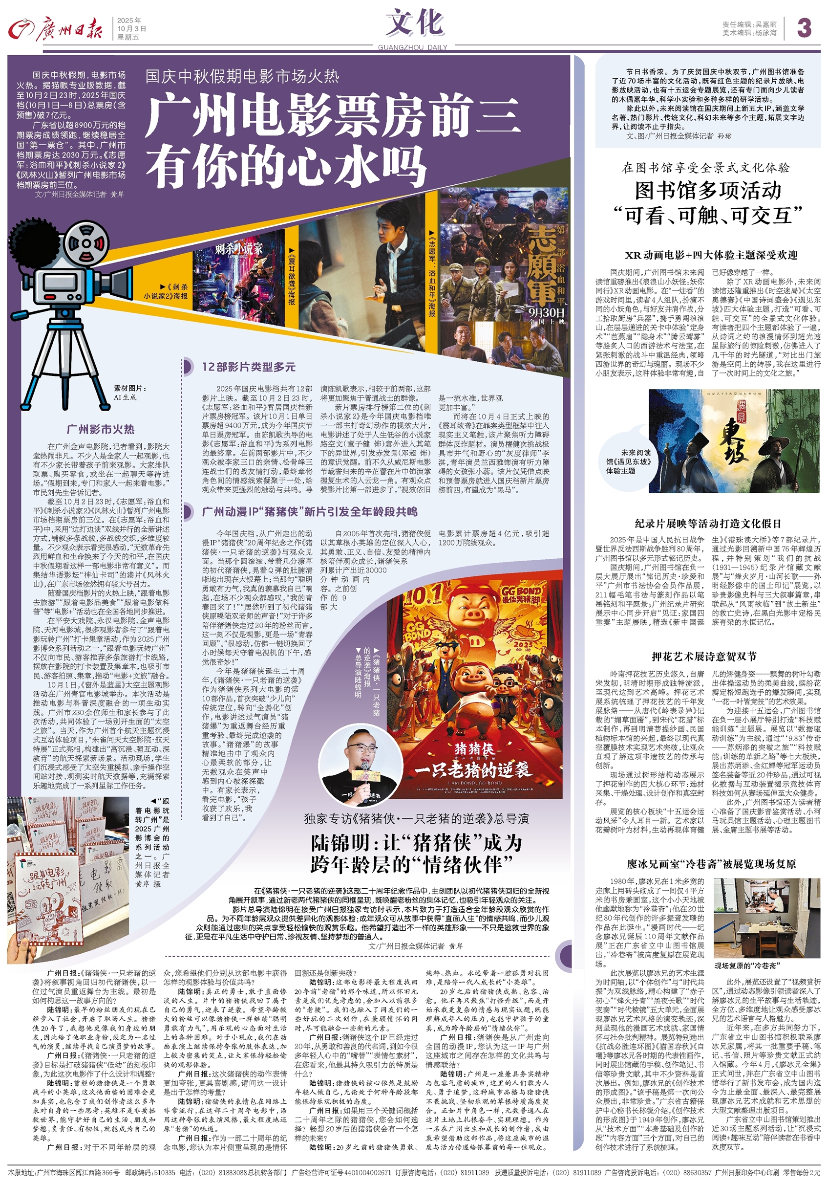 - 广州电影票房前三有你的心水吗 国庆中秋假期,电影市场火热。据猫眼专业版数据,截至10月2日23时,2025年国庆档(10月1日—8日)总票房(含预售)破7亿元。 广东省以超8900万元的档期票房成绩领跑,继续稳居全国“